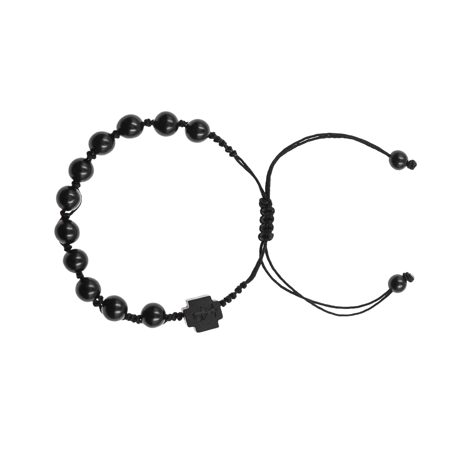 Bransoletka została wykonana z gładkich, czarnych koralików z hebanu indonezyjskiego. To egzotyczne drewno jest niezwykle trwałe, ma głęboki, matowy kolor, co nadaje bransoletce elegancki i minimalistyczny wygląd. W centralnej części umieszczono większy koralik w kształcie krzyża, symbolizujący Pasję Chrystusa.