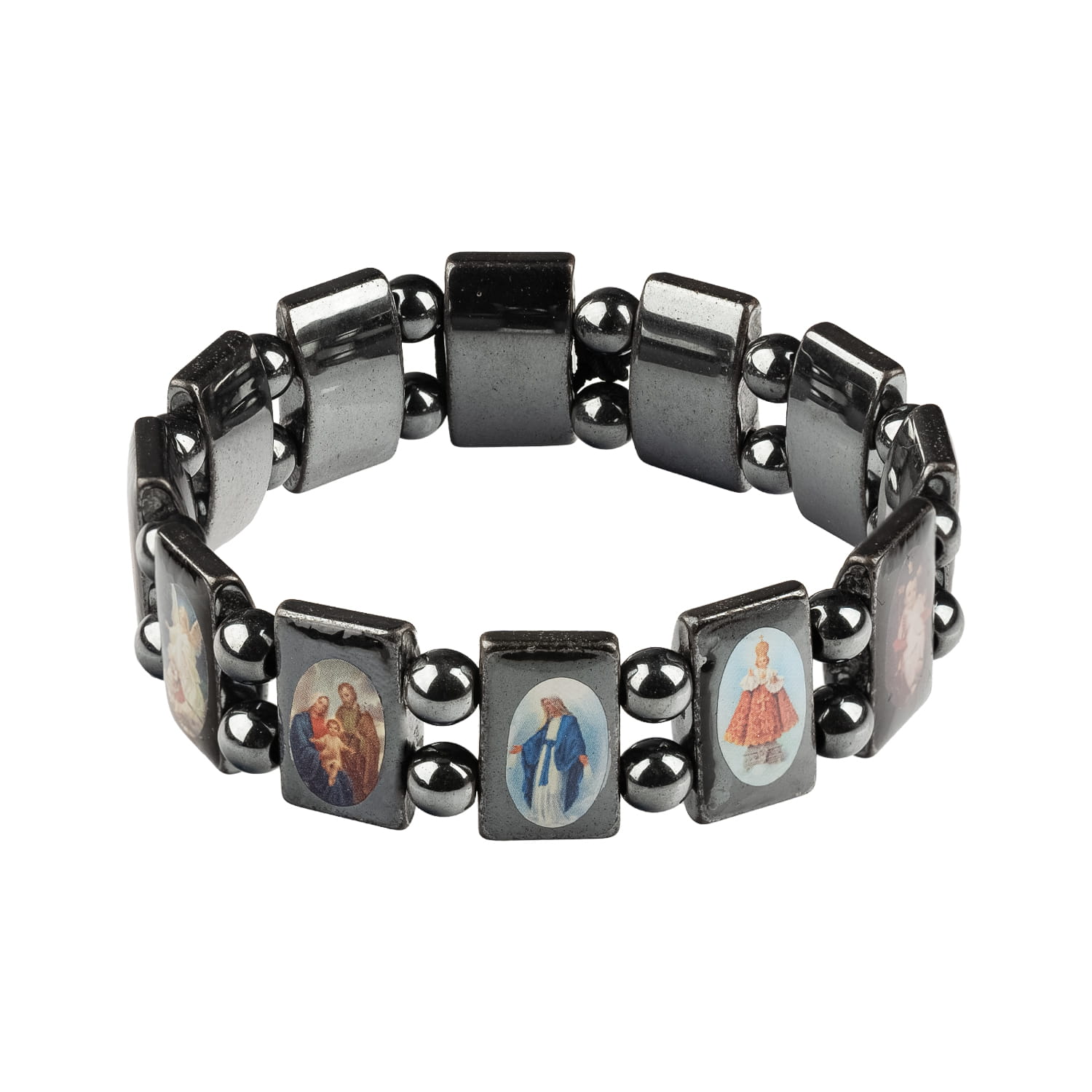Materiał: Hematyt, żyłka elastyczna, metal z wizerunkami świętych