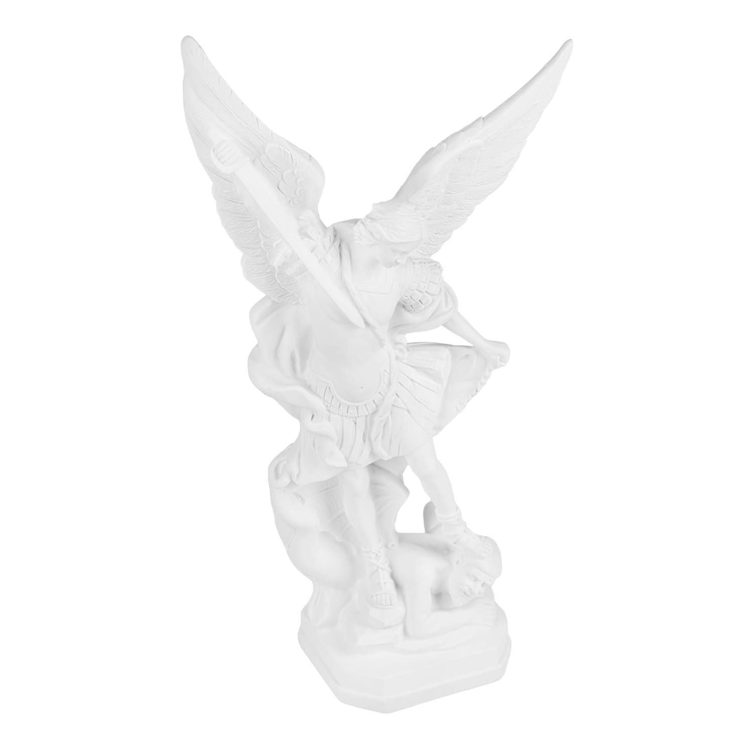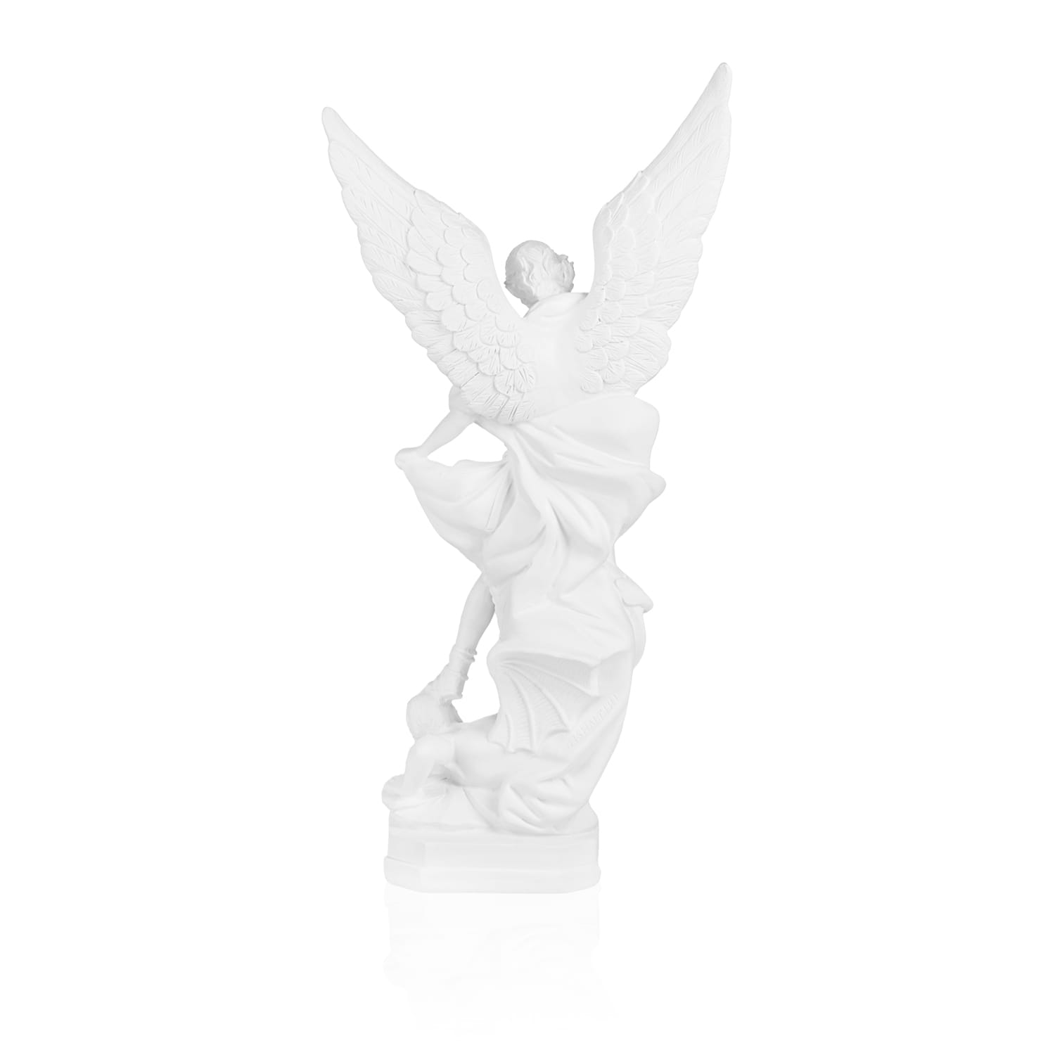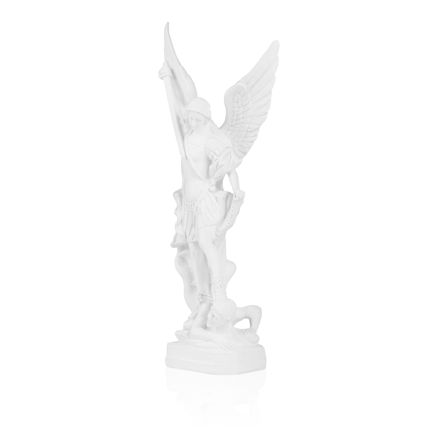 Figura została wykonana z trwałej i odpornej masy żywicznej w eleganckim, białym kolorze. Brak tradycyjnego malowania podkreśla klasyczny, rzeźbiarski charakter dzieła, a precyzyjne detale (skrzydła, zbroja, postać pokonanego demona) są doskonale widoczne.
