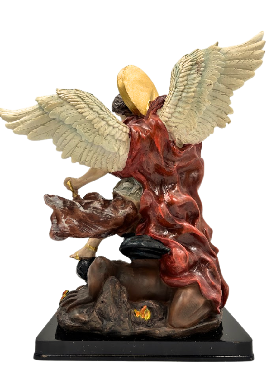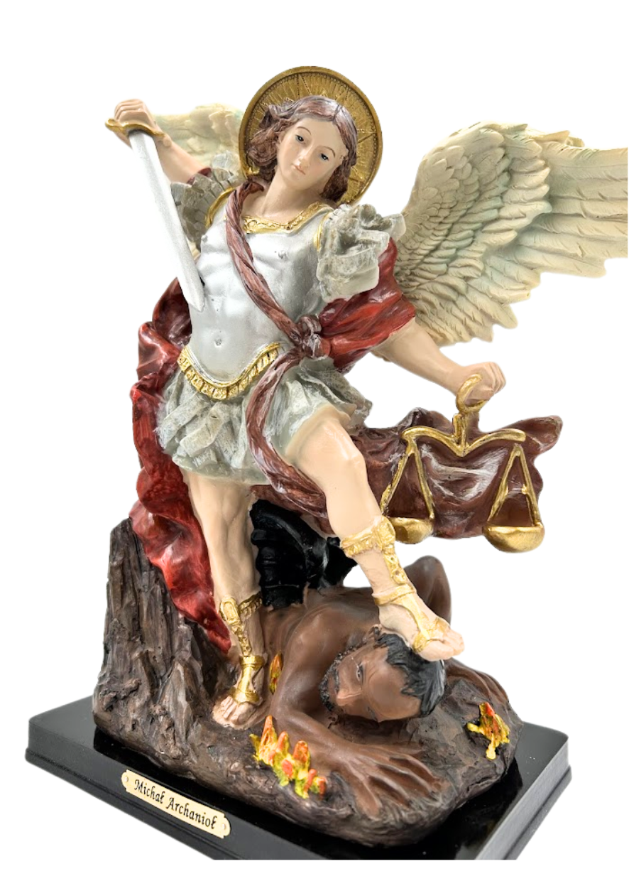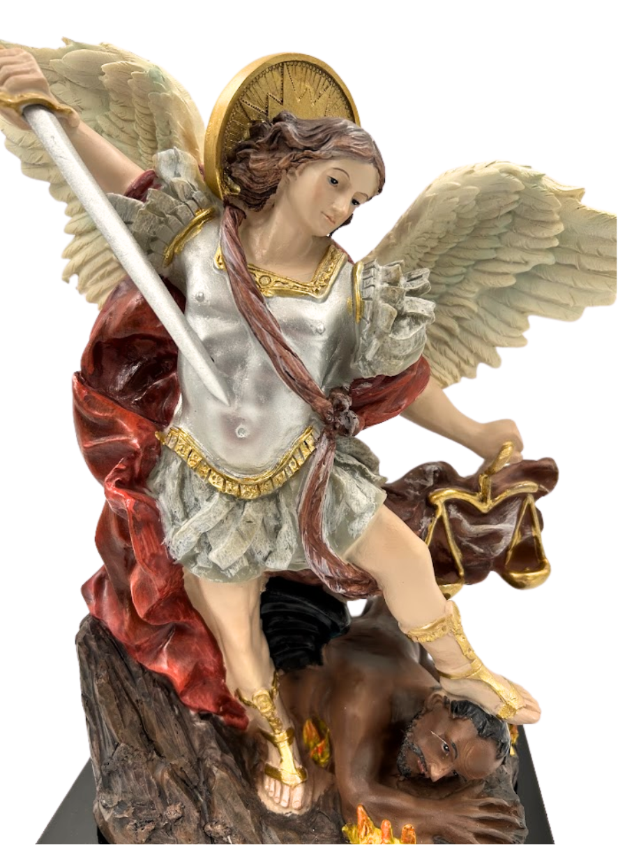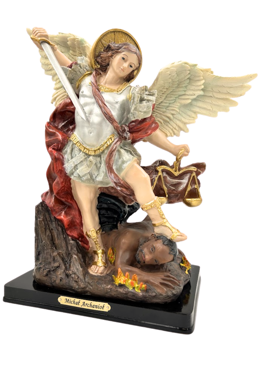 Pięknie wykonana figura Świętego Michała Archanioła z wysokiej jakości masy żywicznej. Detale postaci zostały starannie odwzorowane, co nadaje figurze głębi i wyjątkowego wyrazu. Idealna jako dekoracja religijna do domu, kaplicy, kościoła lub jako wyjątkowy prezent duchowy.