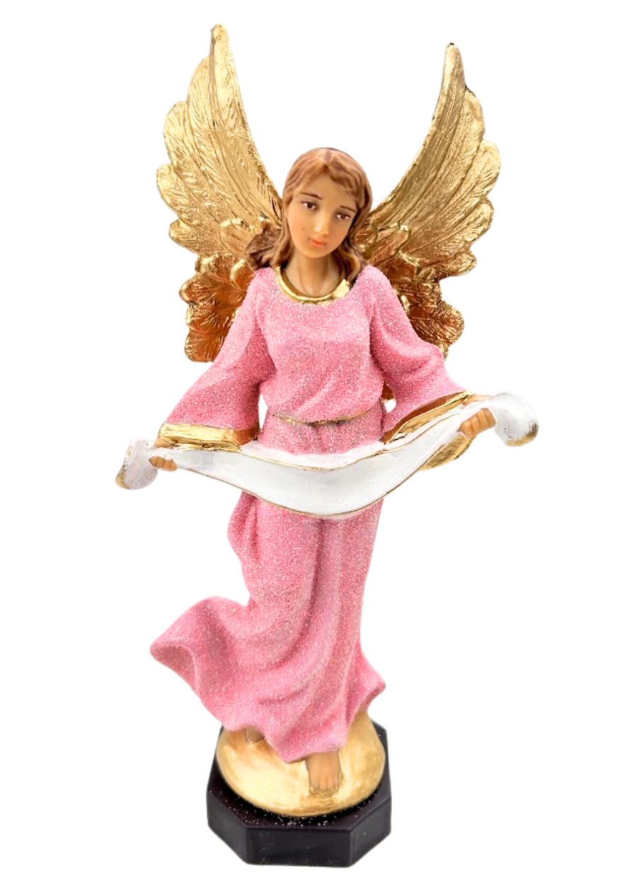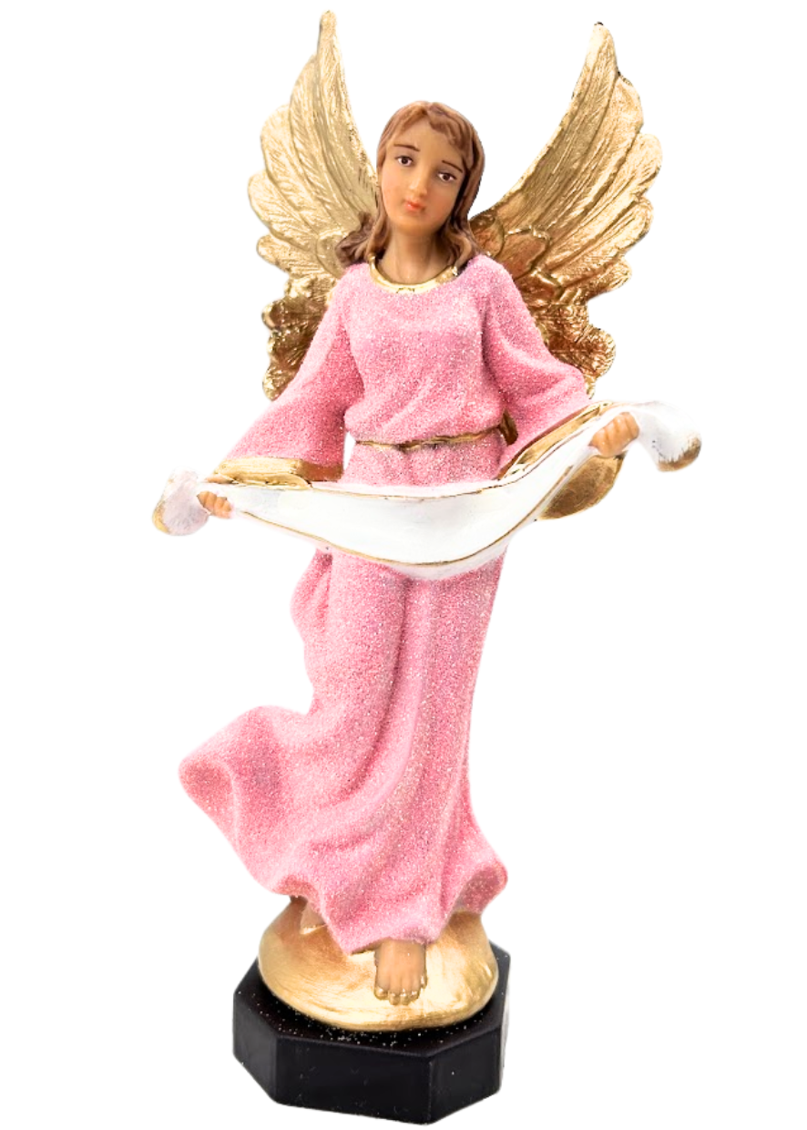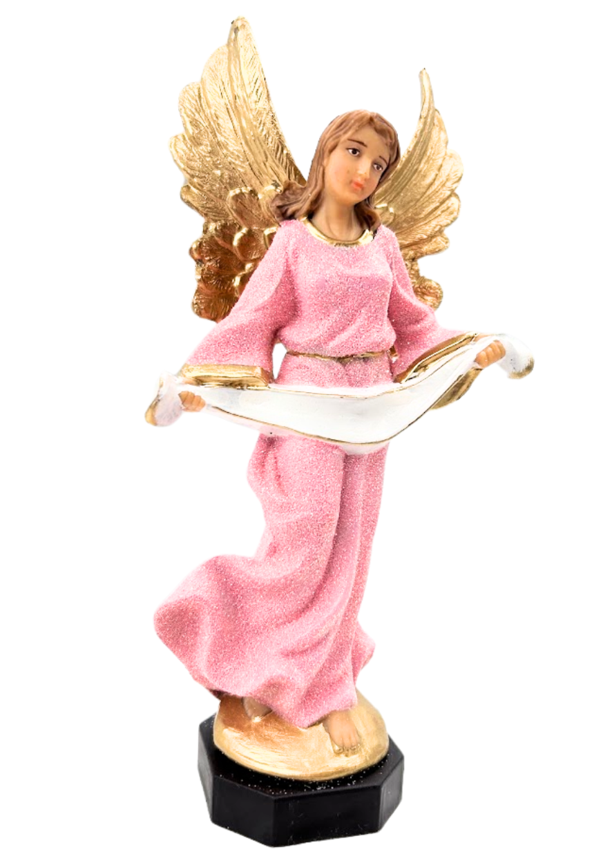 Figurka Anioła w kolorze różowym, z białą szarfą, możliwość wpisania na szarfie imienia lub innego tekstu.