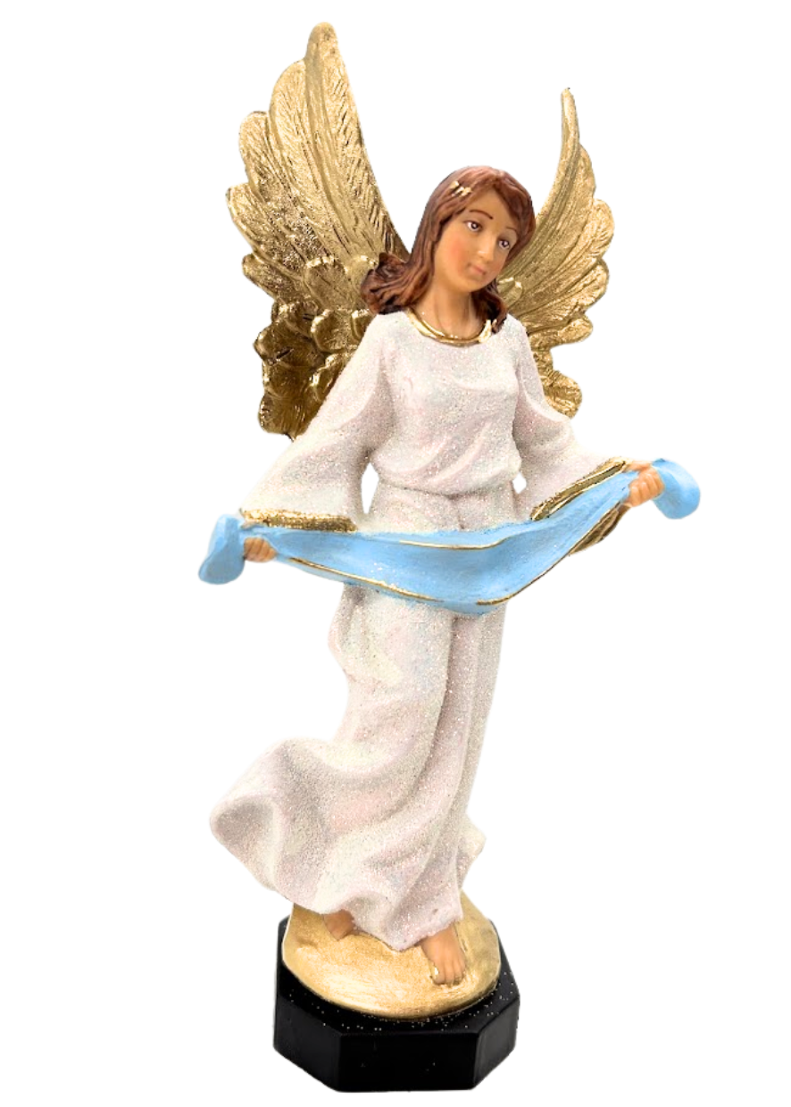 Figurka Anioła w kolorze białym brokatowanym, z niebieską szarfą, możliwość wpisania na szarfie imienia lub innego tekstu.