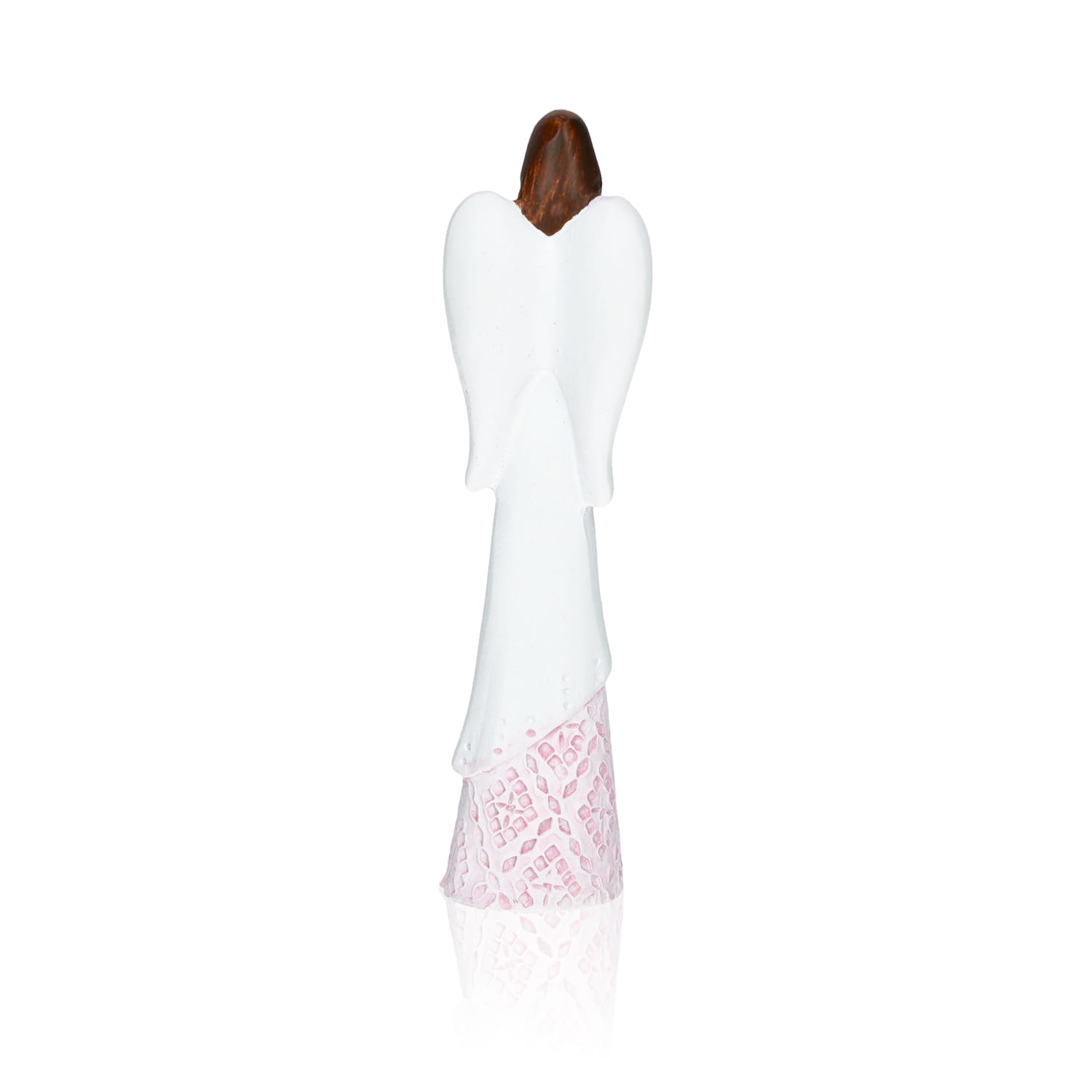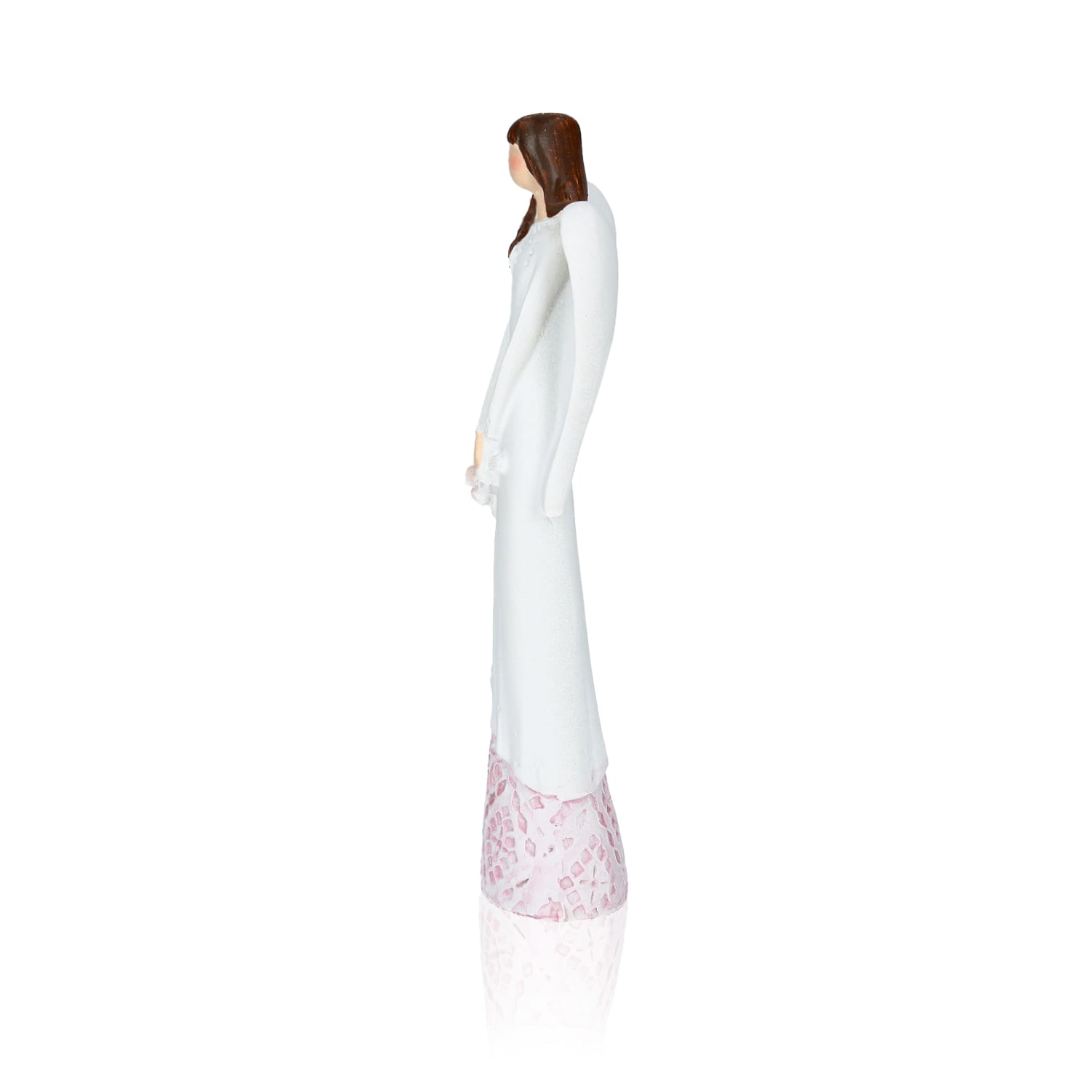 Ta urocza figurka przedstawia aniołka, który delikatnie trzyma w dłoniach bukiet kwiatów, symbolizując niewinność, piękno i delikatność. Figurka została wykonana z trwałej żywicy, a jej biała szata z subtelnymi, ażurowymi wzorami dodaje jej lekkości i elegancji.