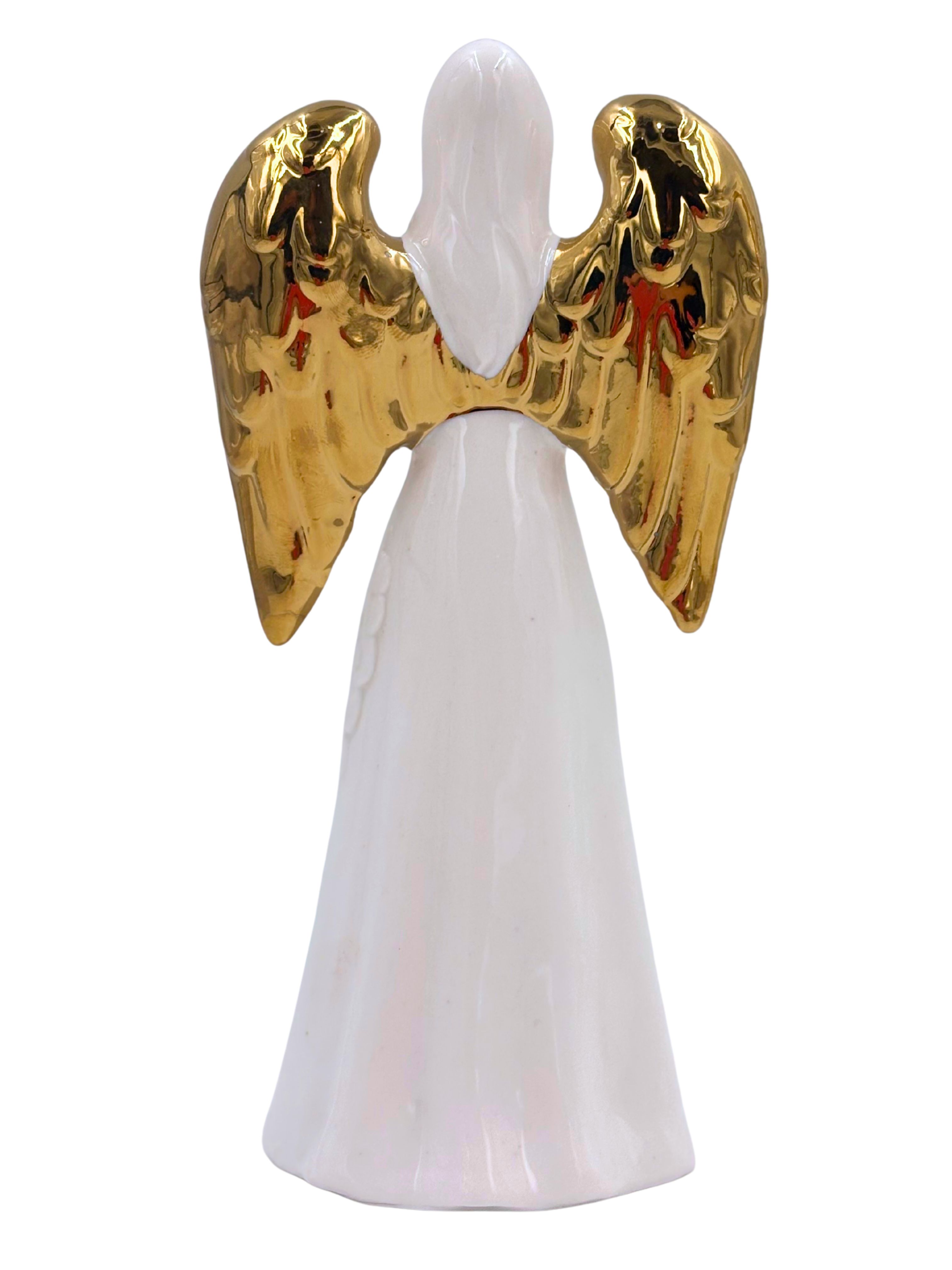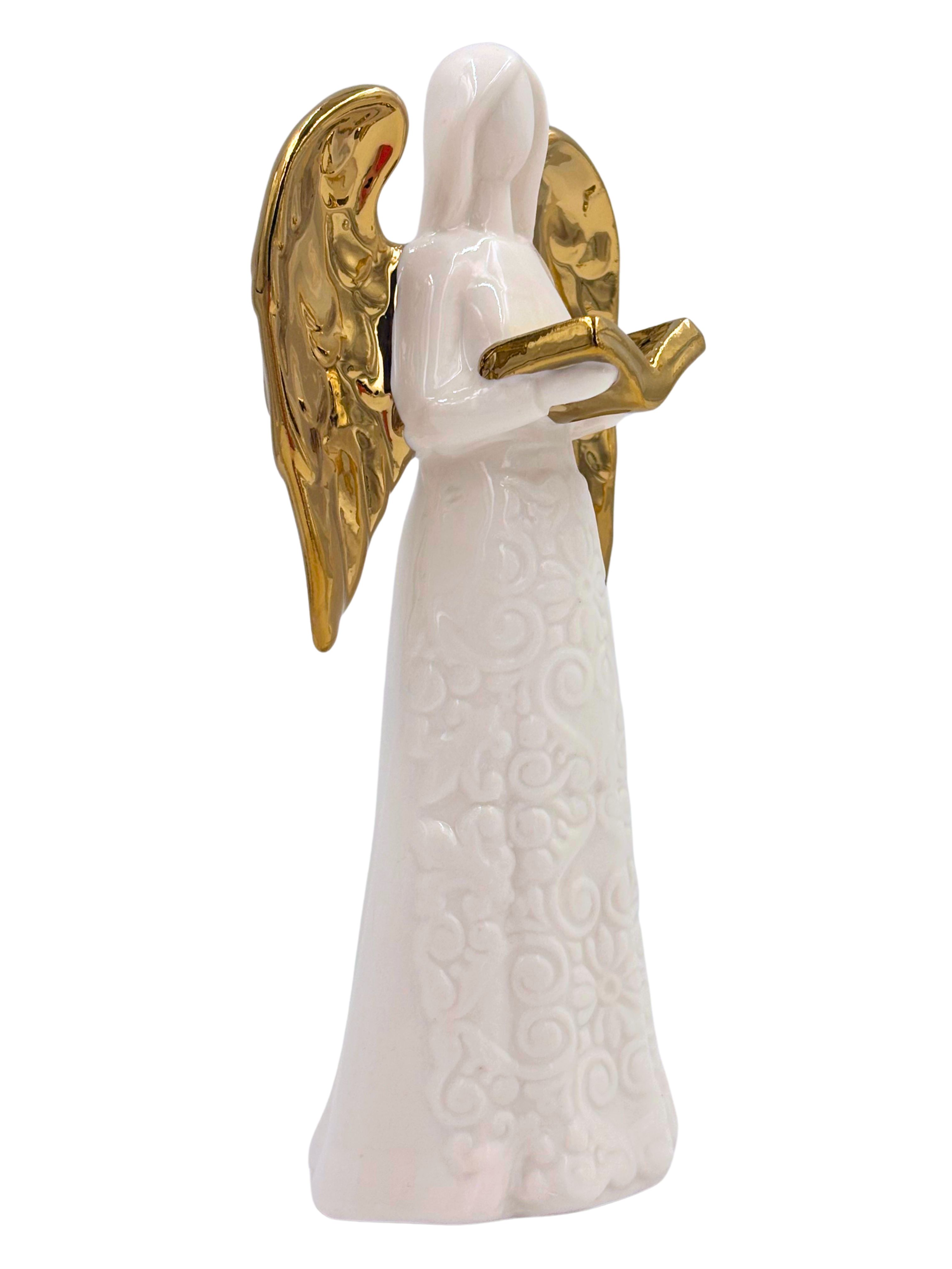 Figurka przedstawia anioła w rozłożystej białej szacie zdobizonej delikatnym ażurowym wzorem – arabeskami i rozetami wtopionymi w ceramikę, które nadają powierzchni wyjątkowej głębi i lekkości. W dłoniach postać trzyma złotą, otwartą księgę – symbol Słowa Bożego i duchowego prowadzenia. Lśniące złocone skrzydła harmonijnie dopełniają kompozycję, tworząc klasyczne, sakralne zestawienie bieli i złota.