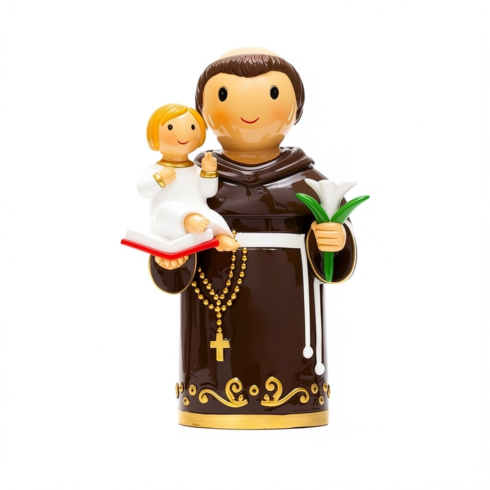 Ta urocza figurka przedstawia świętego Antoniego z Padwy, jednego z najbardziej kochanych świętych na świecie, w wyjątkowo ciepłym, dziecięcym wydaniu. Święty ubrany jest w brązowy habit franciszkański, a na ręku trzyma Dzieciątko Jezus siedzące na otwartej księdze Ewangelii. W drugiej dłoni Antoni dzierży białą lilię – symbol czystości i niewinności.