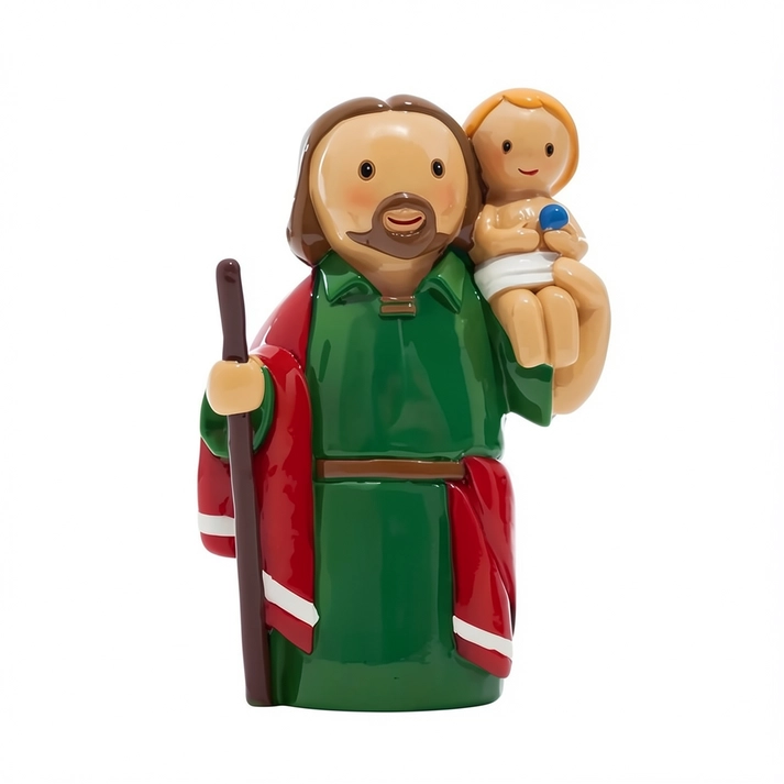Ta radosna figurka przedstawia świętego Krzysztofa, legendarnego olbrzyma, który według tradycji przenosił wędrowców przez rzekę. W naszej kolekcji „Mali Patroni” został on ukazany w niezwykle ciepłej, dziecięcej formie. Święty Krzysztof ubrany jest w zieloną tunikę i czerwoną opończę, a w dłoni trzyma kostur, który pomaga mu zachować równowagę. Na jego ramieniu siedzi Mały Jezus – trzymający w dłoni błękitną kulę ziemską – co nawiązuje do imienia świętego, które oznacza „Niosący Chrystusa”.