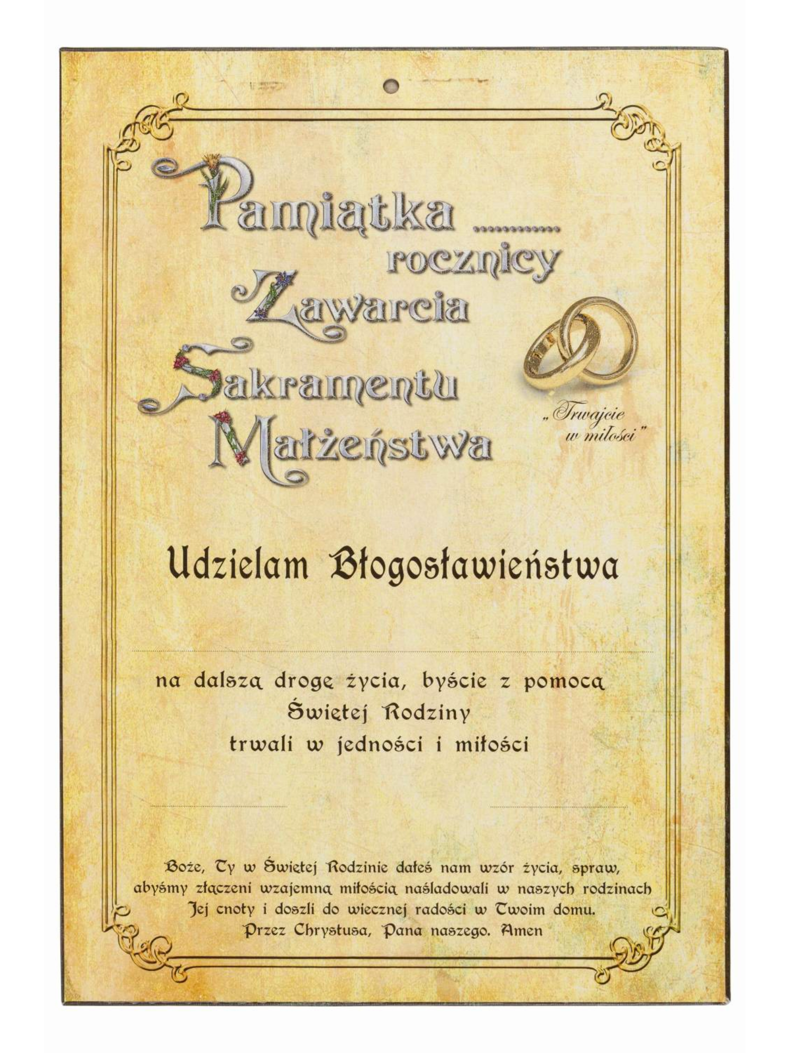Pamiątka zawarcia sakramentu małżeństwa w formie ikony Świętej Rodziny.