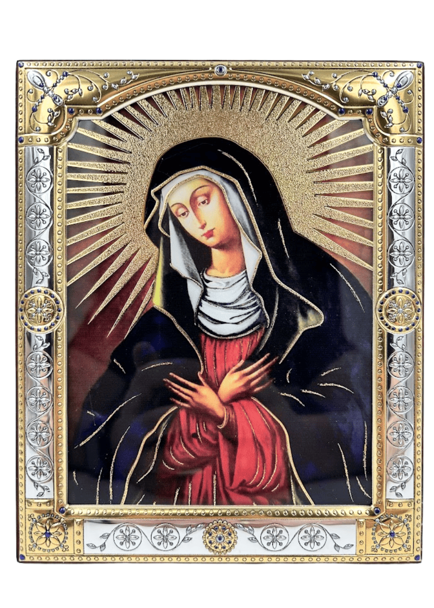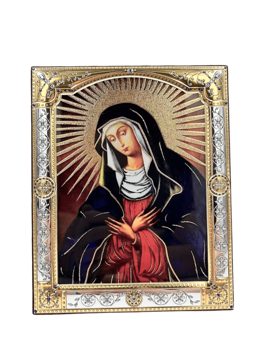 Ikona w rozmiarze 16,7 x 20,6 cm wykonana na brązowej desce, za szkłem, srebrna ramka, złocenia. Wersja do powieszenia lub do postawienia.
