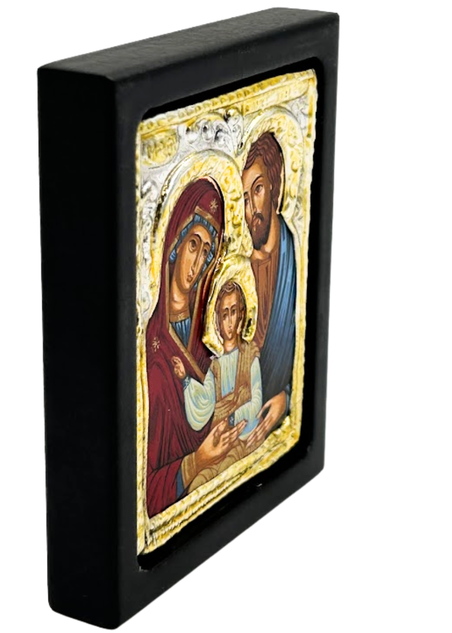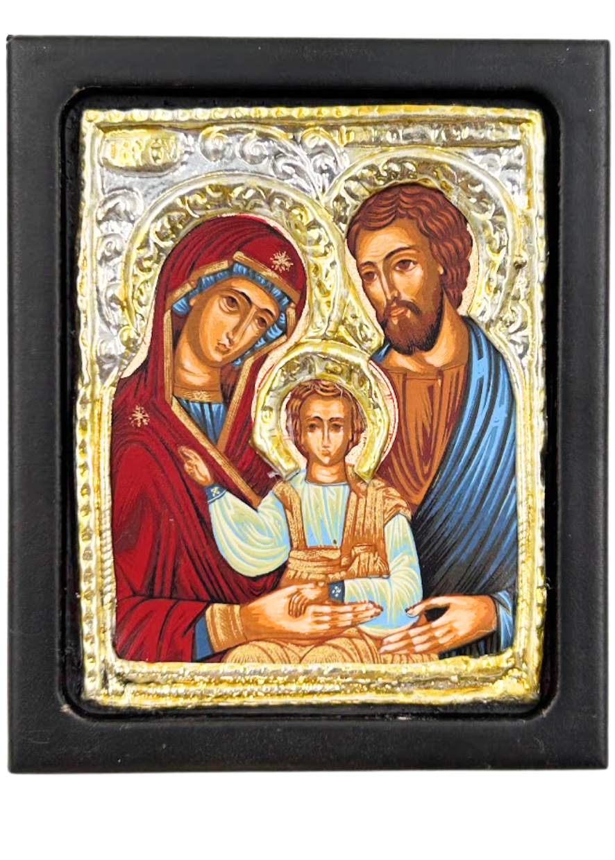 Elegancka ikona bizantyjska przedstawiająca Świętą Rodzinę, wykonana ręcznie w Grecji na drewnianej desce o grubości 1,3 cm. Oprawa ikony została posrebrzana i pozłacana, co podkreśla jej sakralny charakter oraz nadaje wyjątkowego blasku.