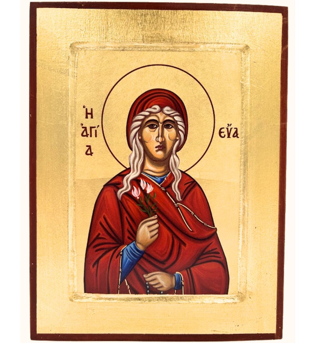 Wizerunek i Symbolika: Ikona ukazuje postać Świętej Ewy w czerwonym płaszczu, trzymającej w dłoni kwiaty lilii, symbolizujące czystość i cnotę. Postać otoczona jest aureolą. W górnej części widnieje grecki napis "H AGIA EVA" (Święta Ewa).