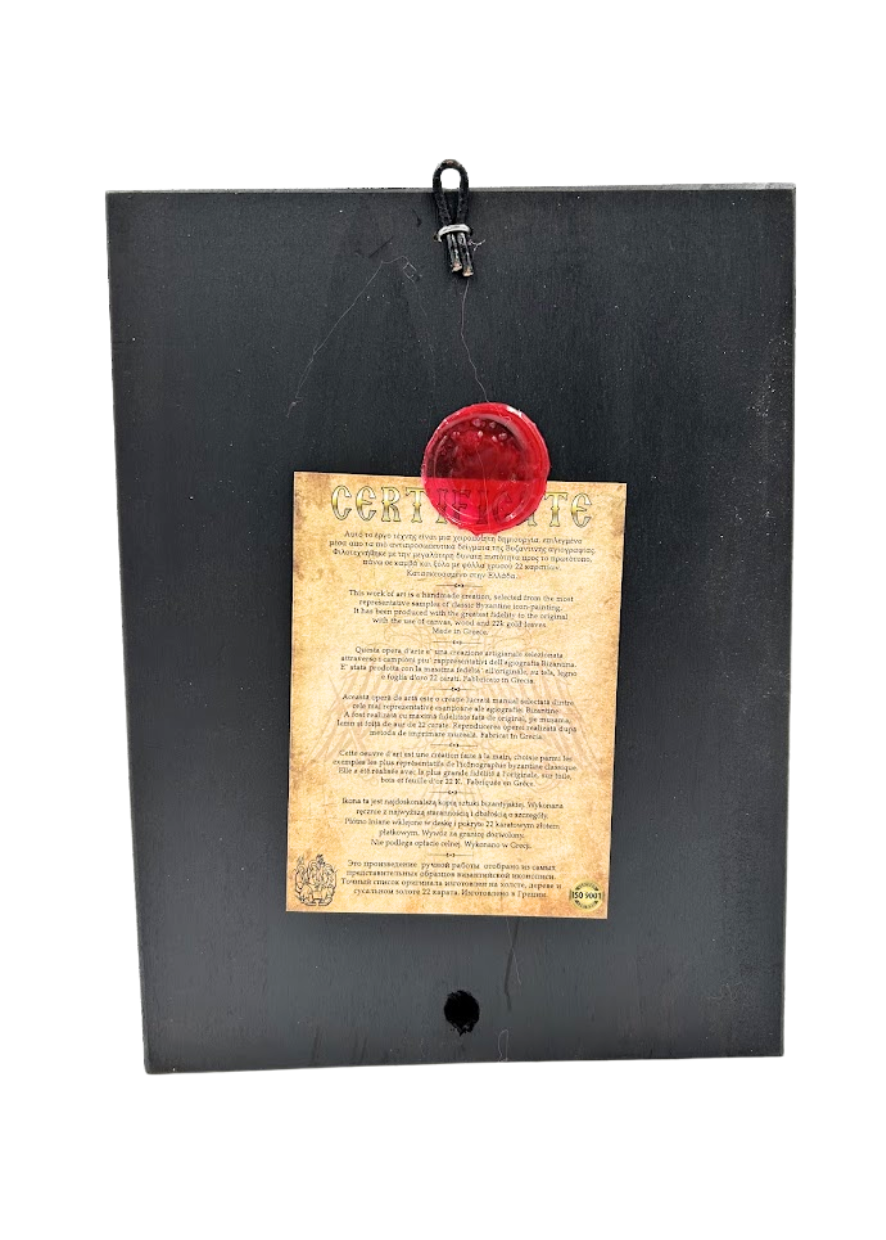 Autentyczność i Prawność: Ikona jest autentycznym rękodziełem z Grecji. Dołączony Certyfikat potwierdza autentyczność wykonania i użytych materiałów. Posiadanie certyfikatu ułatwia możliwość wywozu ikony za granicę.