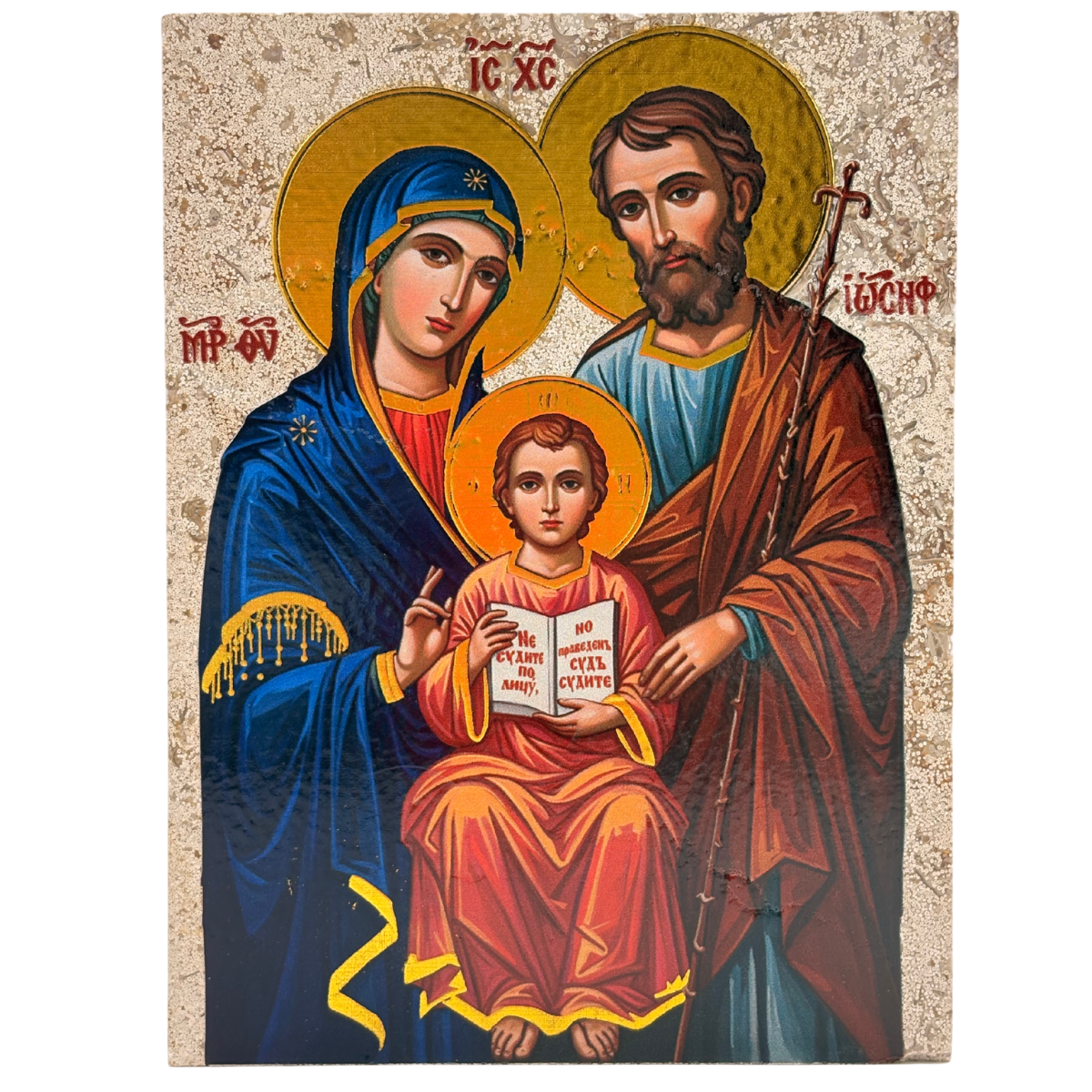 Ta majestatyczna pamiątka o wymiarach 15x20 cm została wykonana z naturalnego, szlachetnego marmuru, którego unikalna struktura i chłodna elegancja stanowią idealne tło dla nasyconego barwami wizerunku. Ikona przedstawia Świętą Rodzinę w klasycznej, bizantyjskiej stylistyce – pełnej symboliki i głębokich, żywych kolorów. Złote nimby oraz precyzyjne detale szat Maryi, Józefa i Dzieciątka Jezus tworzą kompozycję pełną dostojeństwa i duchowego ciepła.