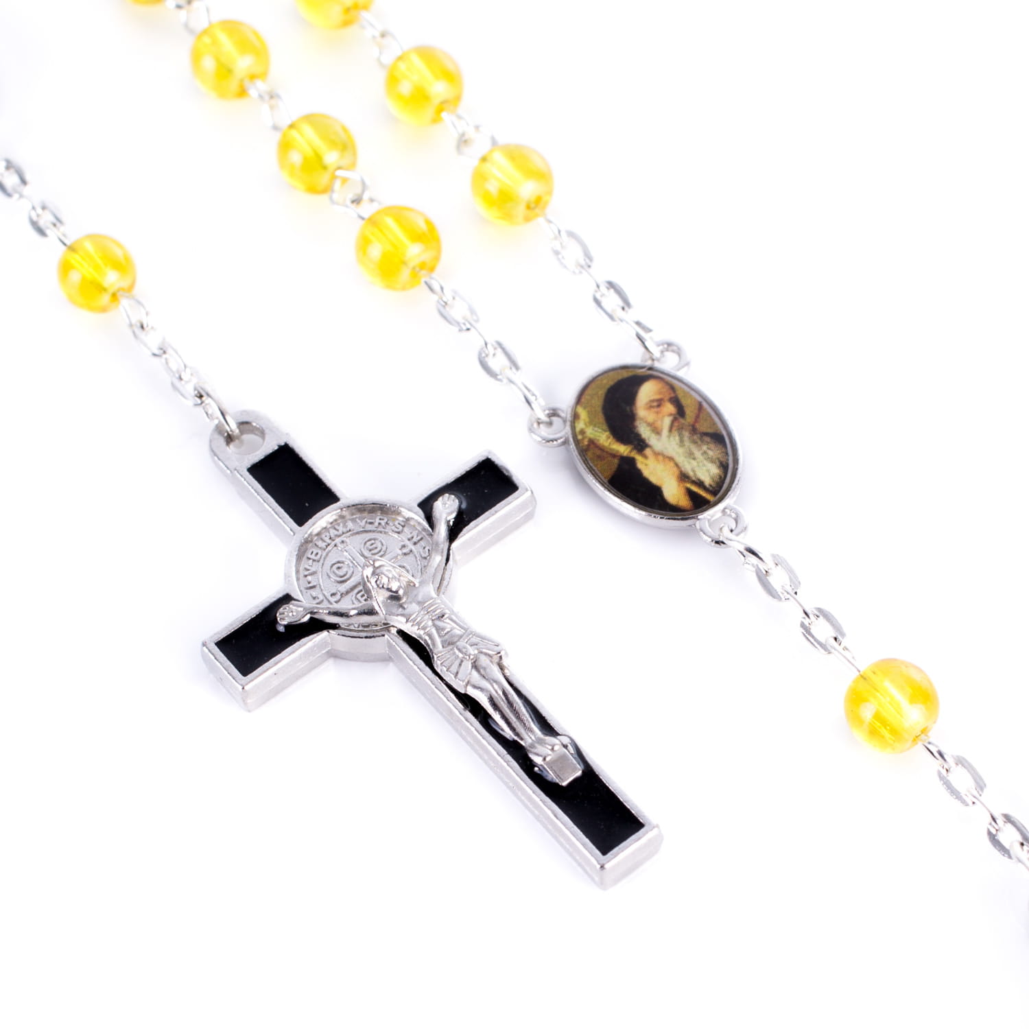 Różaniec składa się z koralików o średnicy 6 mm, wykonanych z lśniącego szkła, połączonych trwałym, metalowym łańcuszkiem. W miejscu medalika umieszczono Wizerunek Świętego Benedykta z charakterystycznym krzyżem.