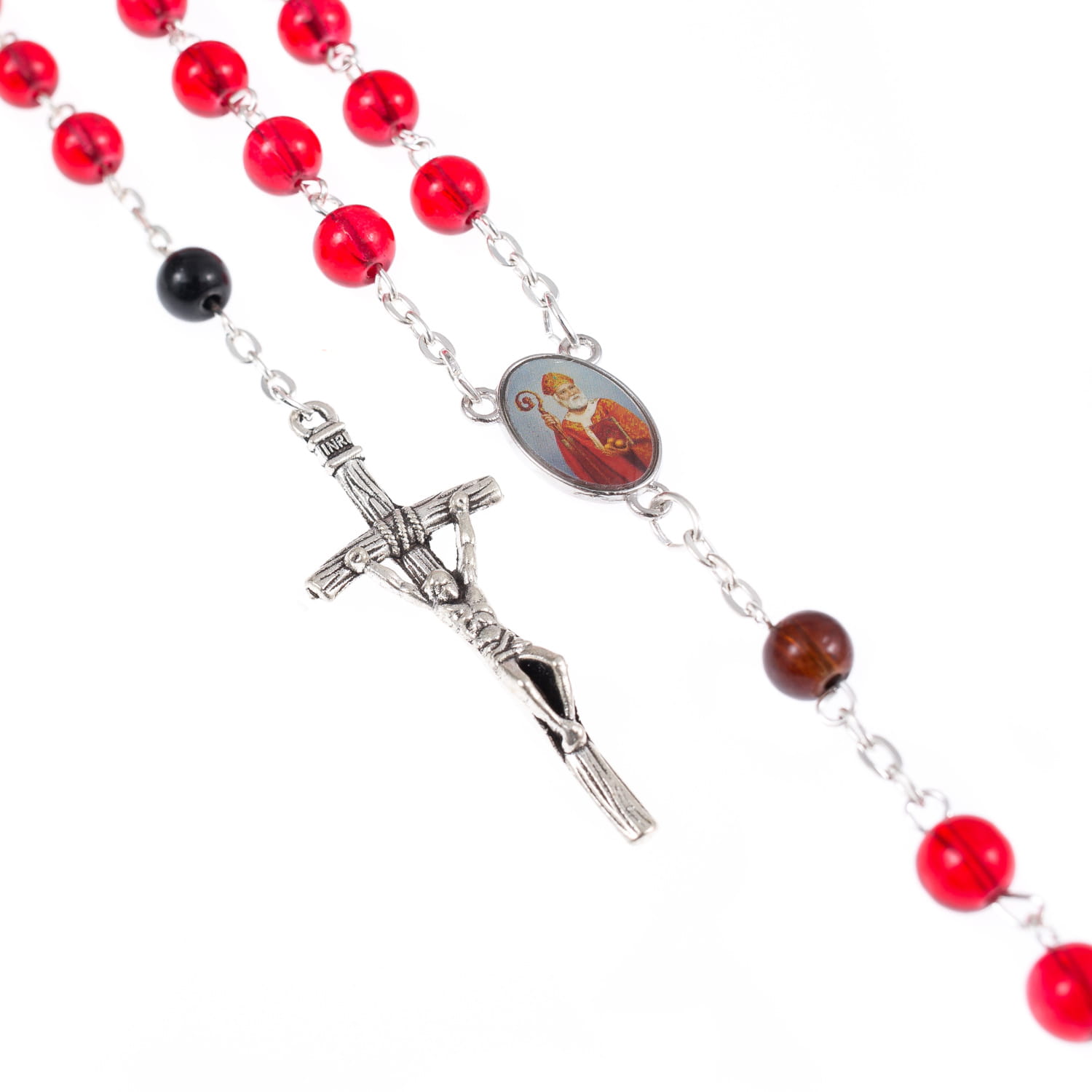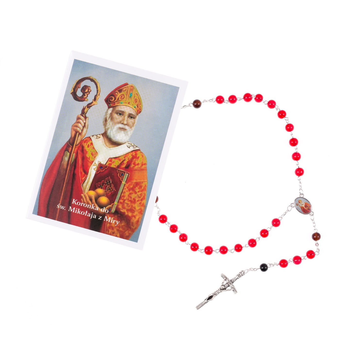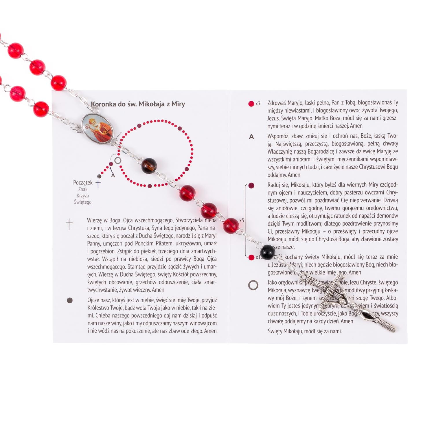 Różaniec składa się z koralików o średnicy 6 mm, wykonanych z lśniącego szkła, połączonych trwałym, metalowym łańcuszkiem. W miejscu medalika umieszczono wizerunek Świętego Mikołaja, co dodaje koronce szczególnej wartości duchowej.