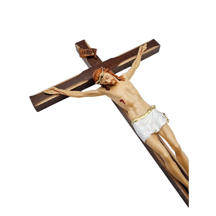 Krzyż drewniany w kolorze brązowym.
