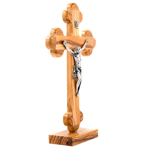 Krucyfiks z drewna oliwnego z ramionami zakończonymi w formie trójliścia i z podstawą.