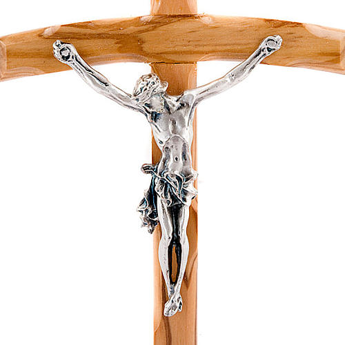 Elegancki krucyfiks stojący wykonany z naturalnego drewna oliwnego, o unikalnym, zakrzywionym kształcie ramion. Figurka Ukrzyżowanego Chrystusa została wykonana z posrebrzanego metalu i ręcznie polerowana, co podkreśla kunszt i dbałość o detale.
