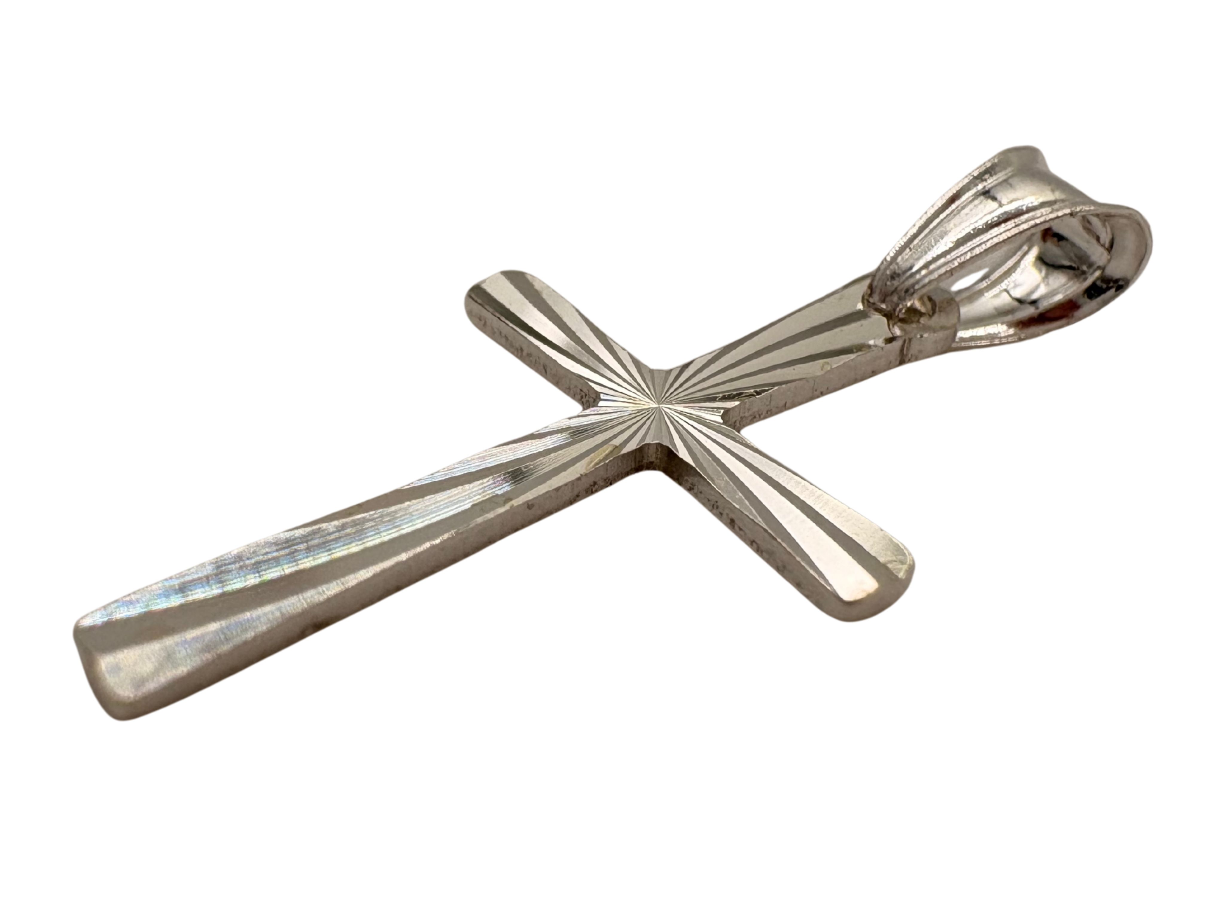 Ten nowoczesny i niezwykle efektowny krzyżyk to propozycja dla osób ceniących minimalistyczną formę z unikalnym zdobieniem. Wykonany z najwyższej jakości srebra próby 925, wyróżnia się charakterystycznym diamentowaniem. Promieniste nacięcia wychodzące z punktu przecięcia ramion krzyża tworzą efektowny, słoneczny wzór, który przepięknie rozprasza światło, nadając biżuterii wyjątkowego blasku nawet przy najmniejszym ruchu.