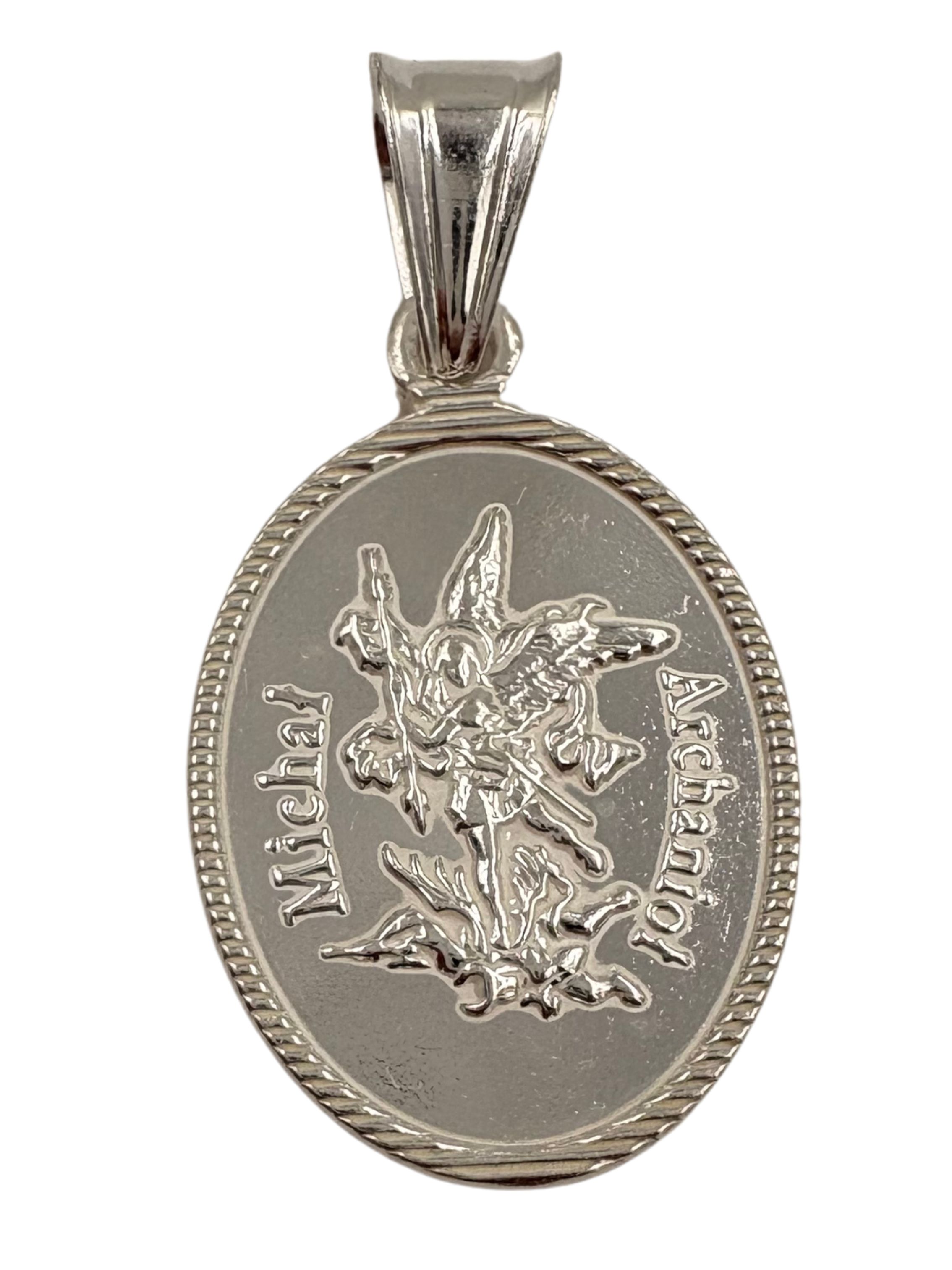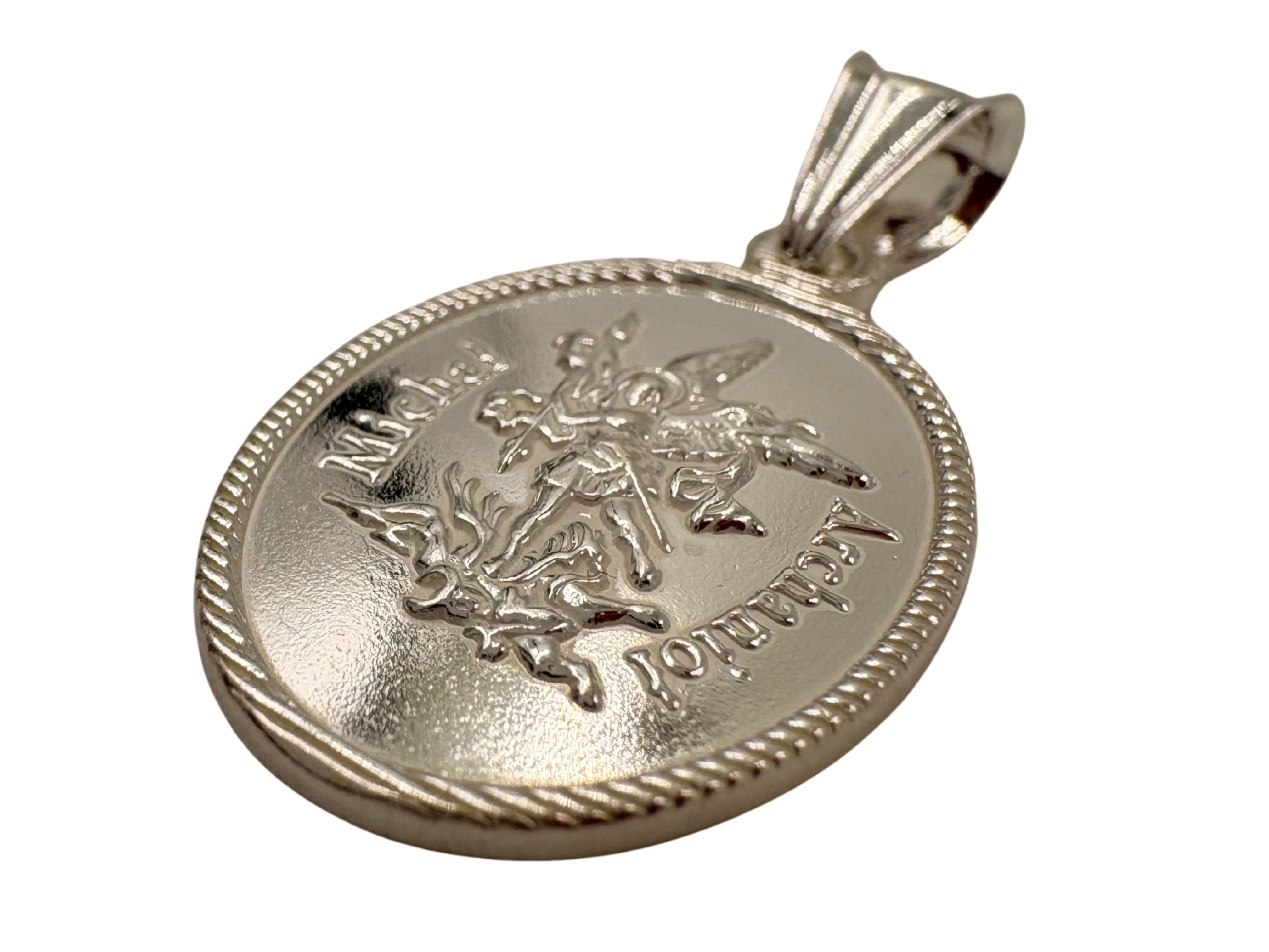 Prezentujemy misternie wykonany medalik z wizerunkiem św. Michała Archanioła – wodza niebieskich zastępów i potężnego patrona walczących ze złem. Medalik został wybity w srebrze najwyższej próby 925, co gwarantuje jego trwałość i szlachetny wygląd. Centralna scena przedstawia Archanioła w pełnej chwale, triumfującego nad upadłym aniołem, co symbolizuje zwycięstwo dobra nad złem. Dynamikę tej sceny podkreśla kunsztowne, wypukłe tłoczenie, które nadaje postaciom trójwymiarowości.