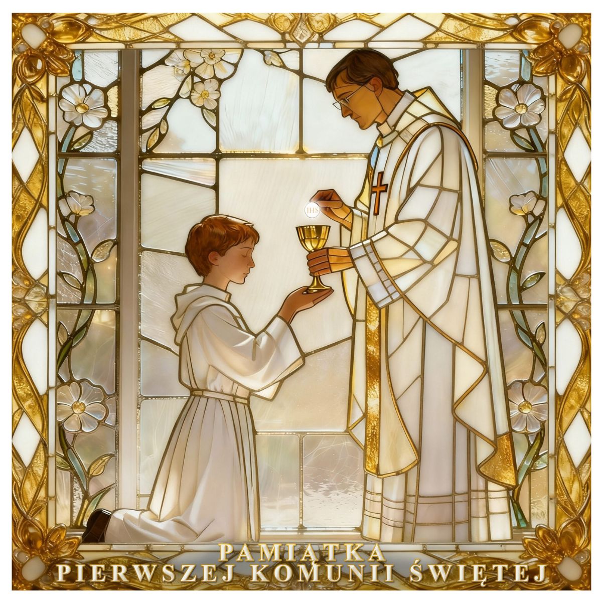 Obrazek przedstawia wzruszającą scenę udzielania sakramentu. Postać klęczącego chłopca oraz kapłana zostały wpisane w bogato zdobioną, witrażową ramę, która zachwyca precyzją detali i ciepłą, słoneczną kolorystyką. Złote akcenty oraz motywy kwiatowe nadają kompozycji blasku, tworząc wrażenie przenikania światła przez kościelne okno.