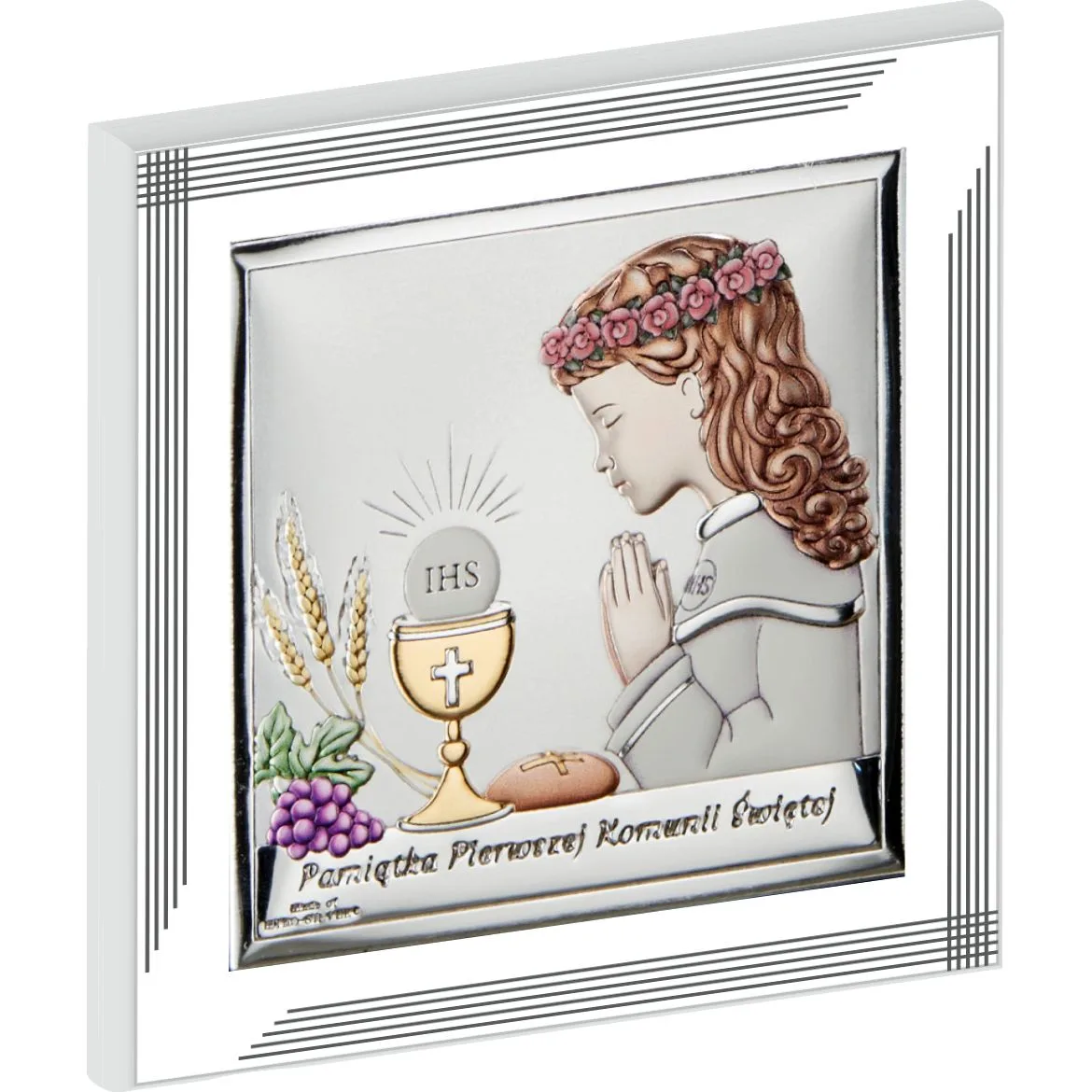 Obrazek srebrny Pamiątka I Komunii Św. 17x17cm dziewczynka