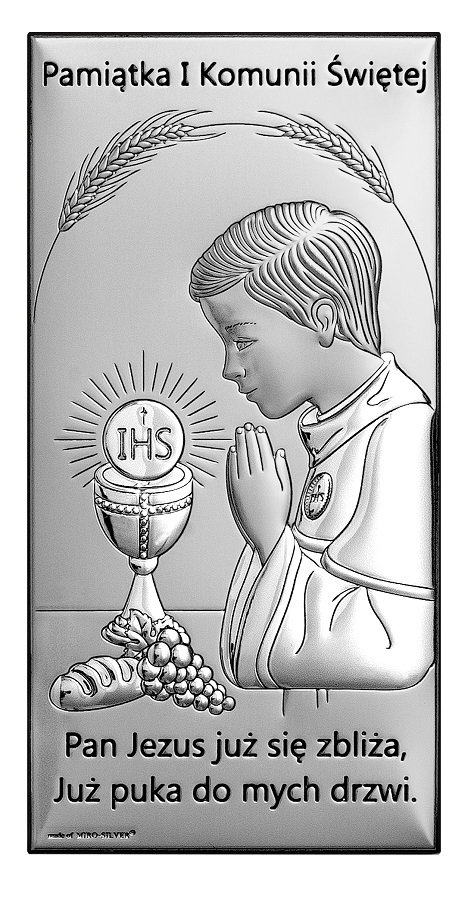 Obrazek srebrny Pamiątka I Komunii Świętej IHS 7x14cm dla chłopca