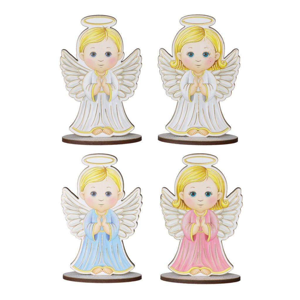 Wizerunek: Obrazek przedstawia Aniołka w formie chłopca, ubranego w niebieską szatę z rączkami złożonymi do modlitwy. Postać w kolorze niebieskim jest jedną z dostępnych wersji. Produkt jest dostępny w kilku wersjach kolorystycznych (chłopiec w kolorze białym i błękitnym, dziewczynka kolor biały i różowy).