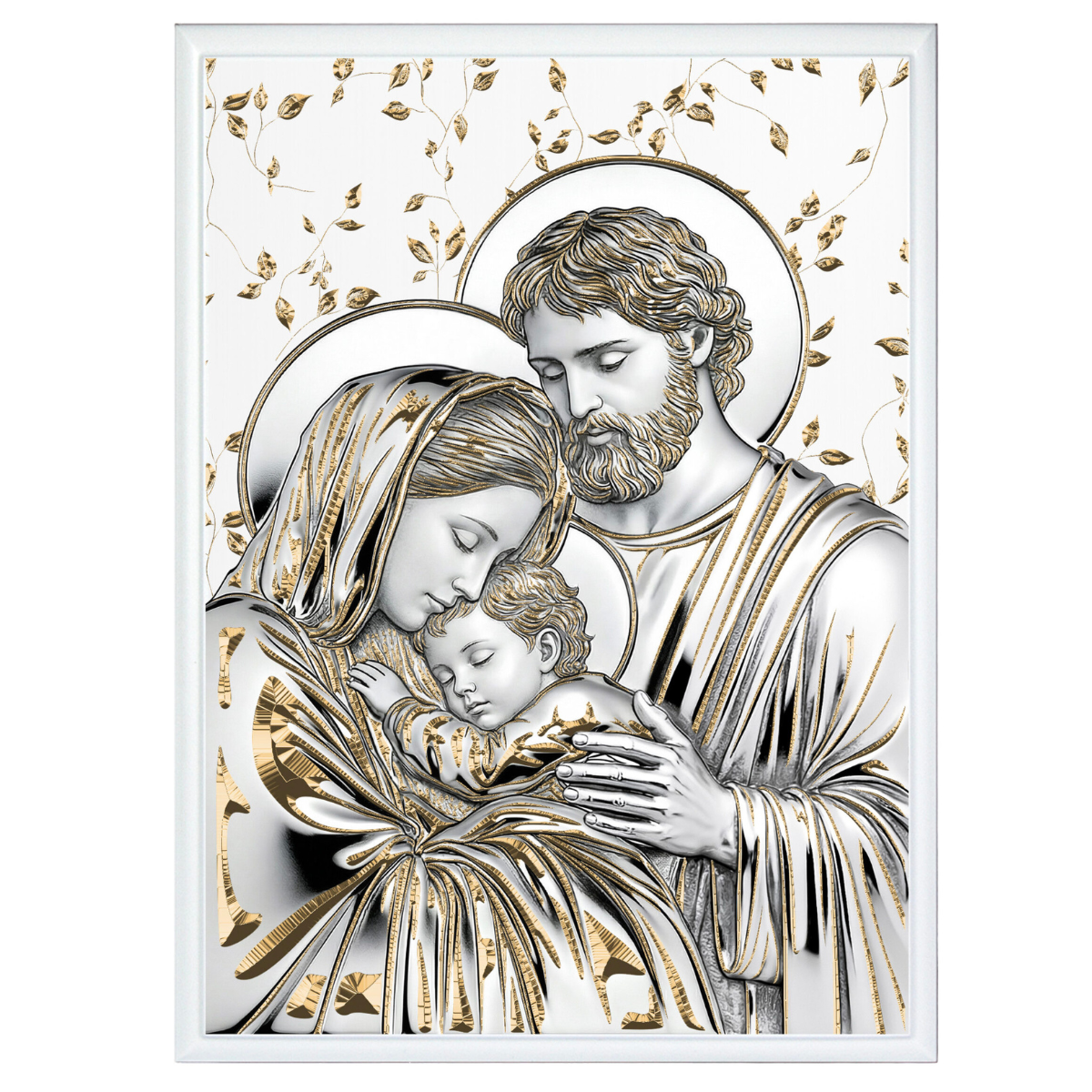 Ta kunsztowna płaskorzeźba o wymiarach 15x20 cm przedstawia wizerunek Świętej Rodziny, wykonany w unikalnej technologii posrebrzania i polerowania bieli z akcentami z bogatego, fakturowanego złota. Srebrzyste powierzchnie i czysta biel płaskorzeźby kontrastują z głębokim, lustrzanym blaskiem złota na draperii i detalach, tworząc obraz pełen światła i harmonii.
