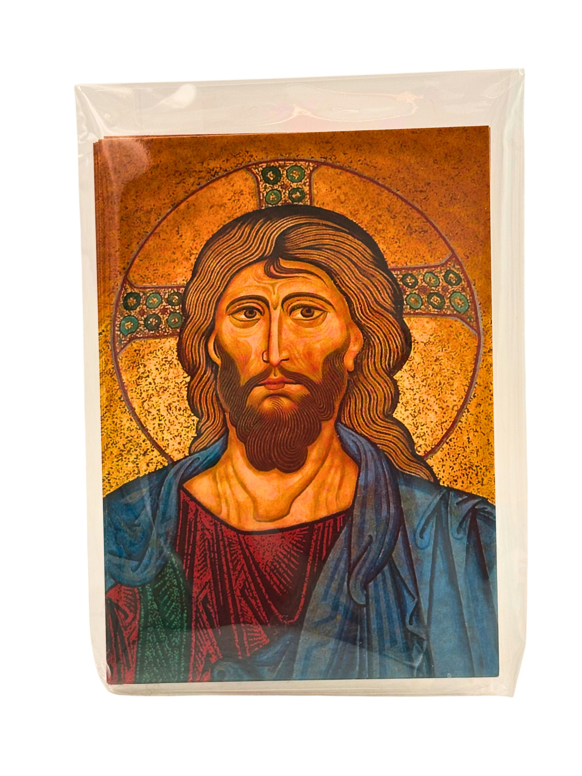 Obrazek przedstawia majestatyczne oblicze Pana Jezusa, wykonane w technice nawiązującej do klasycznej mozaiki sakralnej. Złociste tło, wyraźne kontury oraz głęboka kolorystyka szat podkreślają dostojeństwo postaci Chrystusa.