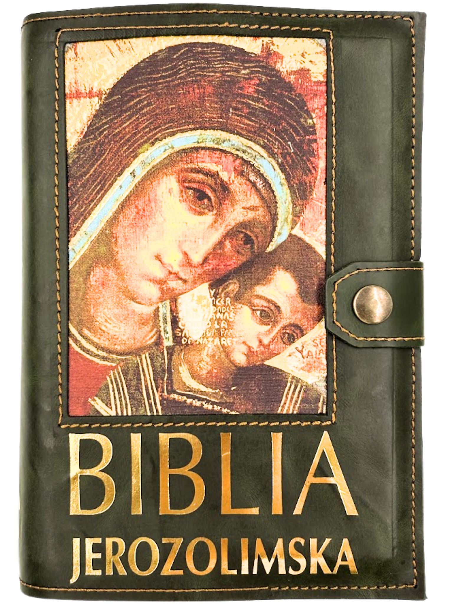 Okładka skórzana z ikoną na Biblię Jerozolimską małą zielona