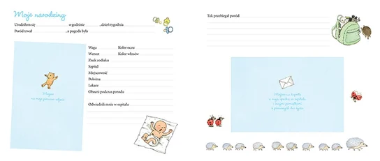 Książka zawiera miejsce, by zapisać najważniejsze spostrzeżenia i wspomnienia oraz wkleić zdjęcia.