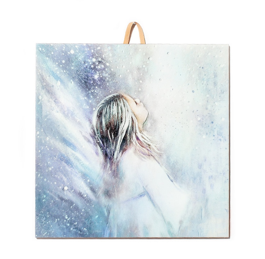 Głęboki Motyw: Postać z uniesioną twarzą, otoczona kosmicznym (lub śnieżnym) pyłem, symbolizuje nadzieję, marzenia, modlitwę i wewnętrzne przebudzenie. Jej eteryczna forma nawiązuje do anielskiej obecności i duchowości.