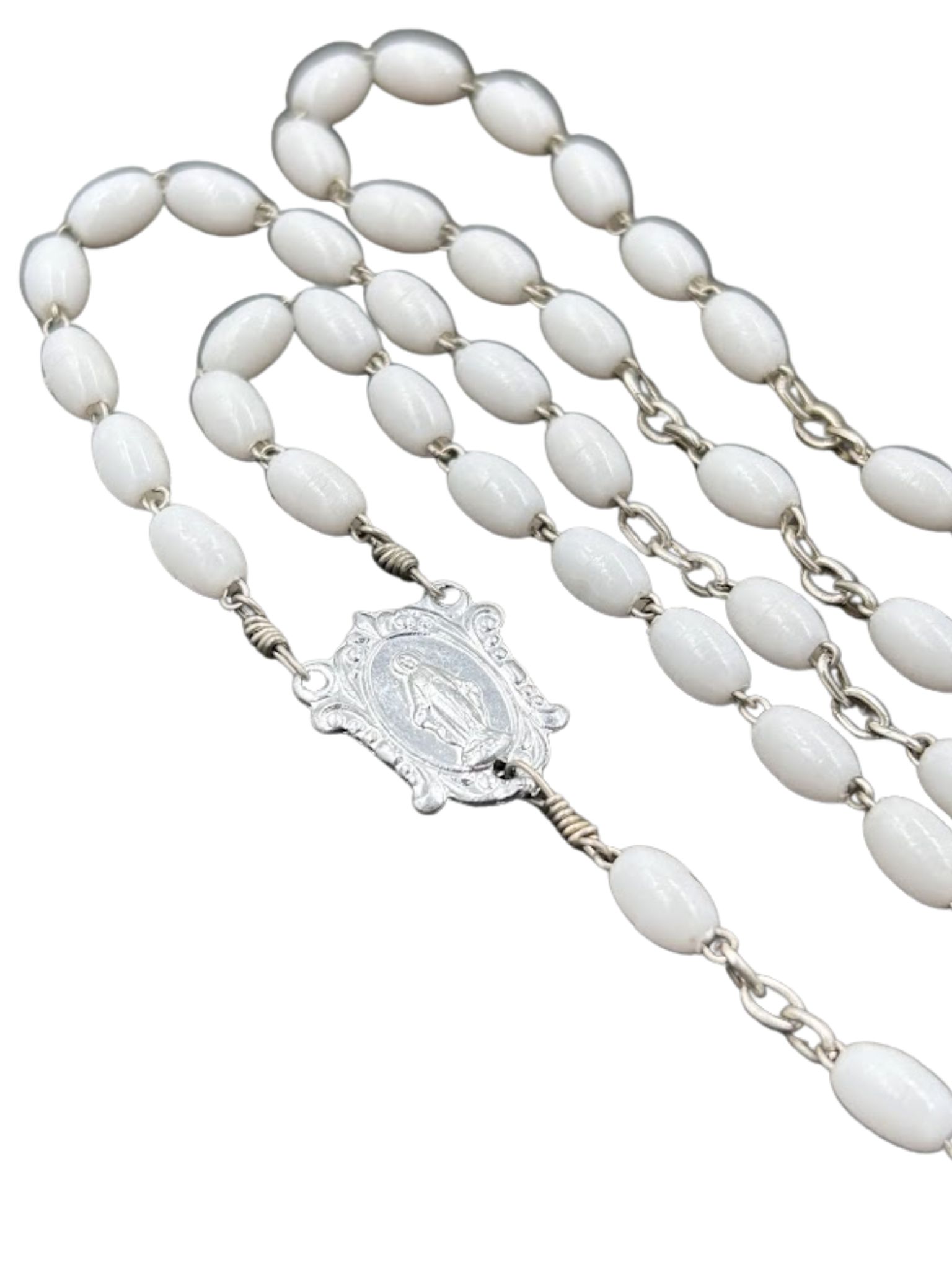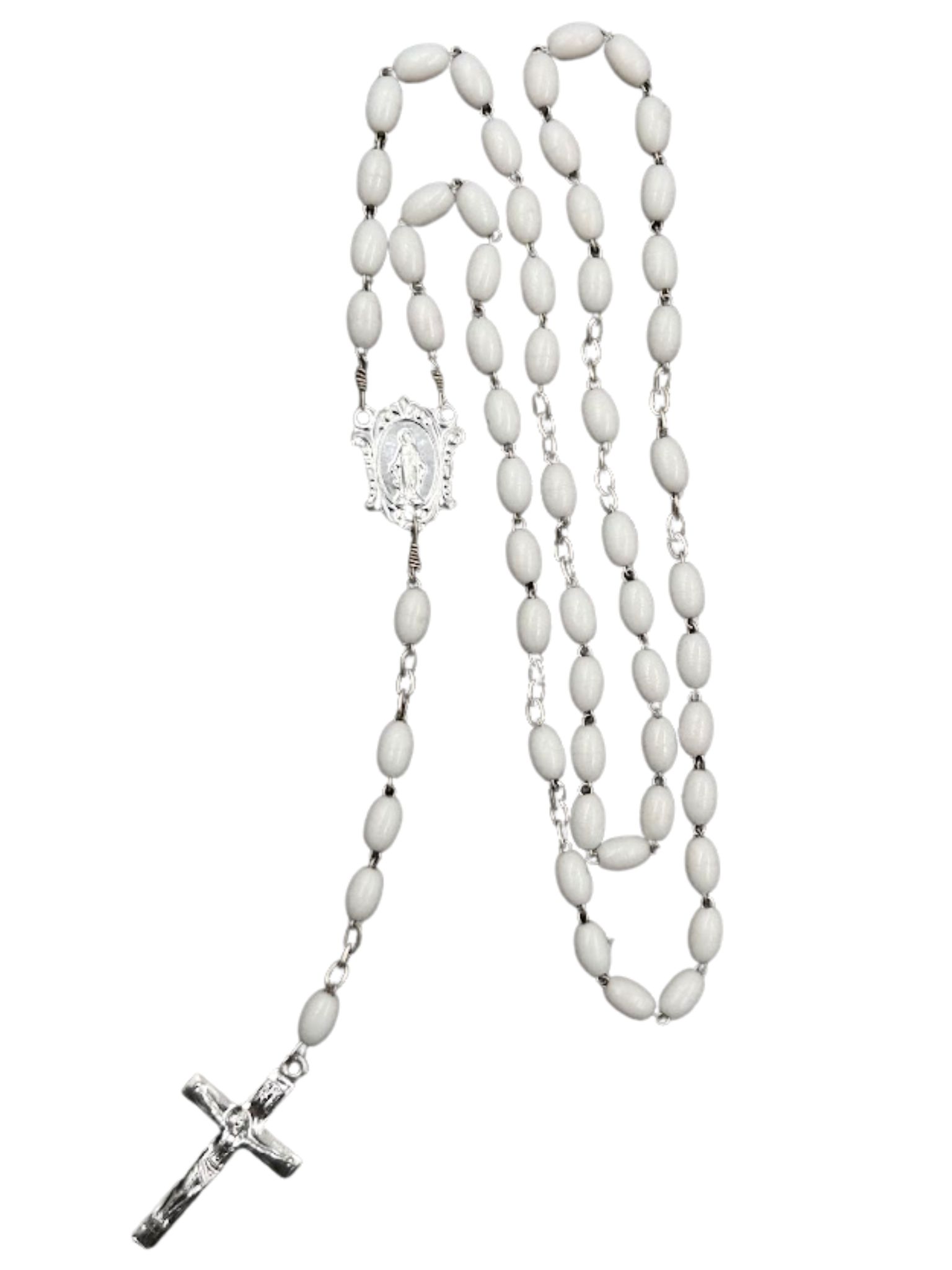 Koraliki różańca wykonane są z białego plastiku, połączonego trwałym metalowym łańcuszkiem. Dzięki temu różaniec jest lekki i wytrzymały.