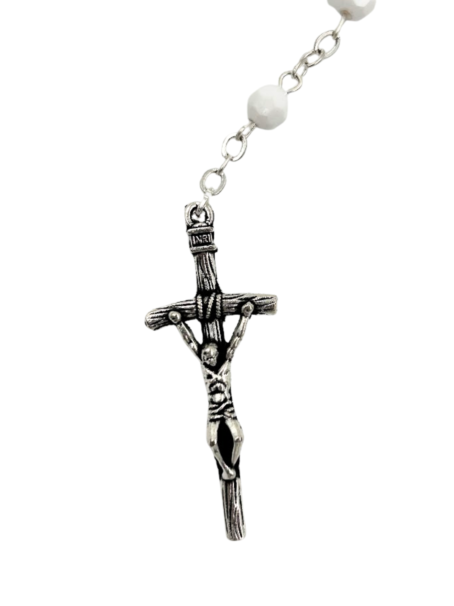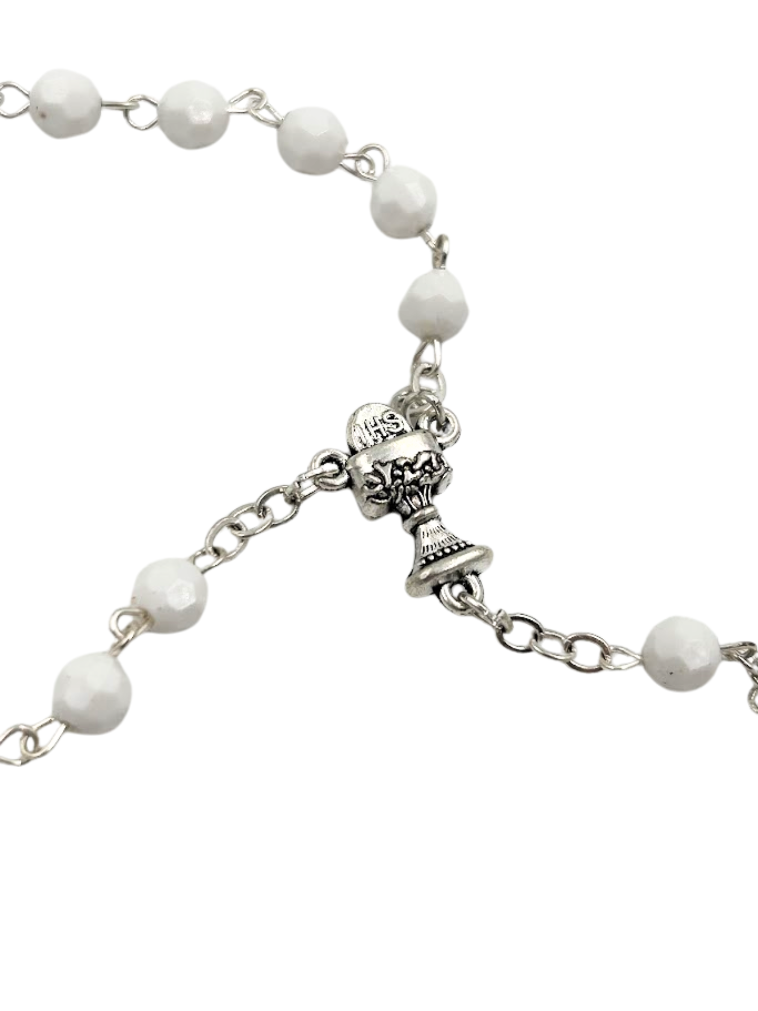Klasyczny różaniec komunijny wykonany z białych, plastikowych paciorków o szlifowanym wykończeniu, umieszczonych na metalowym łańcuszku. Całość dopełnia solidny, metalowy krzyżyk z wizerunkiem Chrystusa.