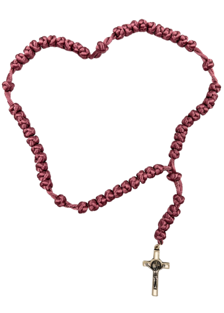 Różaniec sznurkowy pleciony brudny róż krzyż św. Benedykta