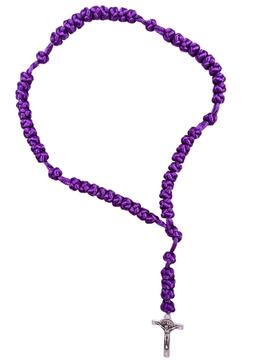 Różaniec sznurkowy pleciony fioletowy krzyż św. Benedykta