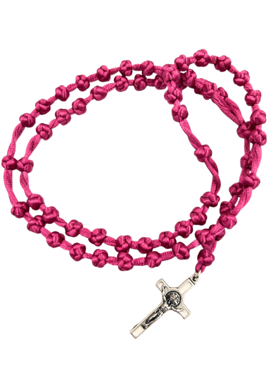 Różaniec sznurkowy pleciony różowy krzyż św. Benedykta